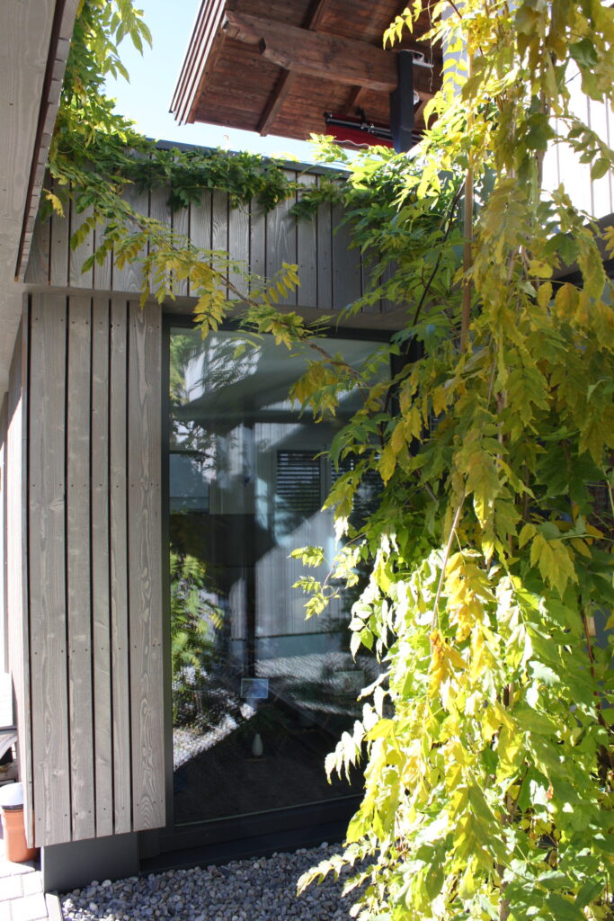 Ein gestalterisches Highlight bildet der geschwungene Bügel, der von der Terrassenüberdachung ausgeht und den Garten vor dem Kinderzimmer einrahmt. Dieser formale Akzent verstärkt die Verbindung zwischen Bauwerk und Natur zusätzlich.