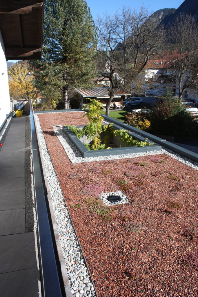 Das Flachdach wird als extensives Gründach ausgeführt und dient gleichzeitig als Dachgarten mit Dachterrasse. Dieser Freibereich steht den Bewohnern der Obergeschosswohnung als zusätzlicher Aufenthaltsraum im Freien zur Verfügung.